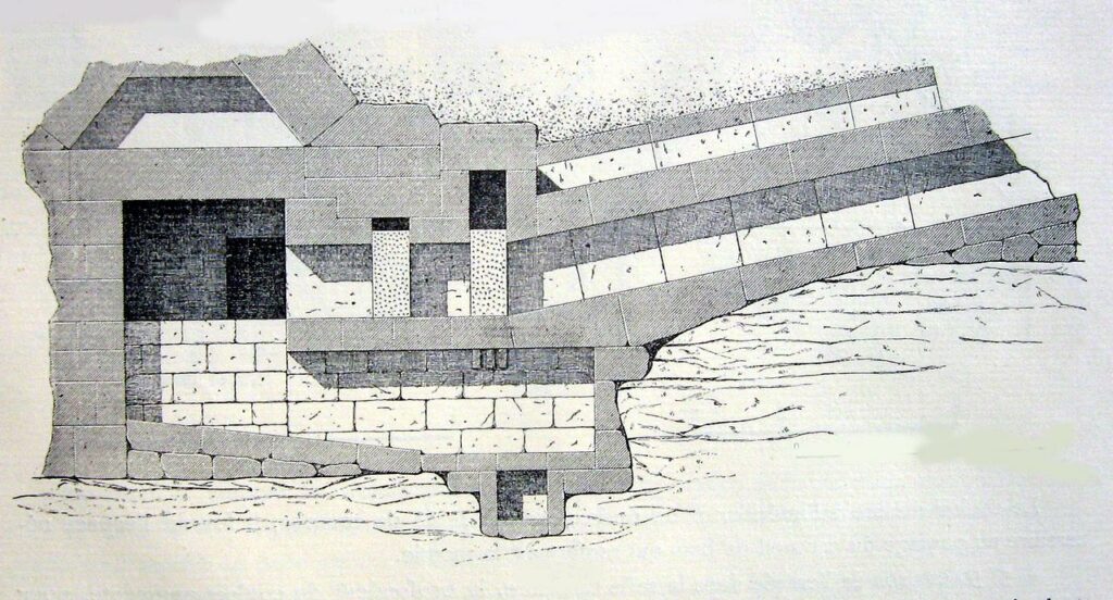 Le couloir descendant menait à un ensemble de salles souterraines dont la chambre funéraire, protégée par un système complexe de herses et de blocs de granit.