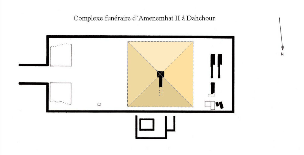 La pyramide d’Amenemhat II se situe dans la zone nord de Dahchour, un site chargé de symbolisme royal.