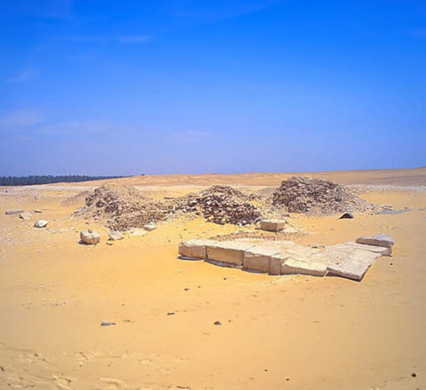 Situé au bord du lac Abousir, le temple de vallée servait de point d’accueil aux processions funéraires. Aujourd’hui réduit à ses fondations, il était autrefois orné de colonnes de granit rouge et de plafonds décorés d’or sur fond bleu foncé.