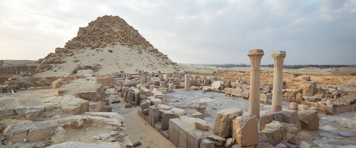 Situé au bord du lac Abousir, le temple de vallée servait de point d’accueil aux processions funéraires. Aujourd’hui réduit à ses fondations, il était autrefois orné de colonnes de granit rouge et de plafonds décorés d’or sur fond bleu foncé.